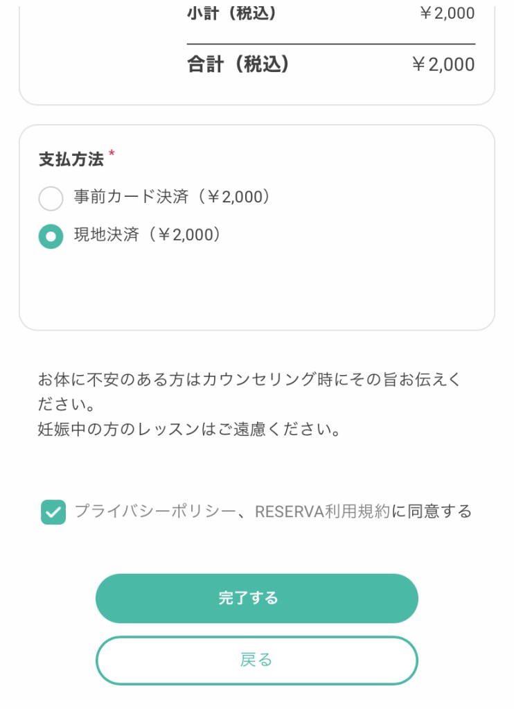 ⑧支払い方法を選択後、[プライバシーポリシー、RESERVA利用規約に同意する]に同意いただき、「完了する」をクリックします。