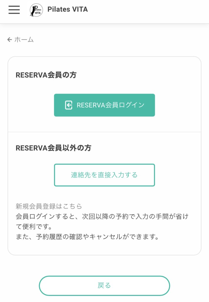 ⑥予約へ進むにはRESERVAへのログインもしくは連絡先などの情報入力が必要になります。